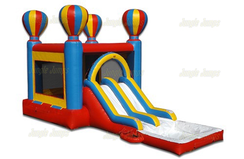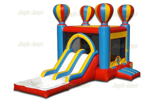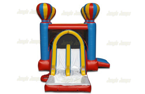 This dual lane combo is sure to delight your children. Not only will they enjoy the bouncing area, but they will be able to race each other down the dual slides. Pictured here with the attached pool. The pool is not included as a dry slide but is easily added on request.